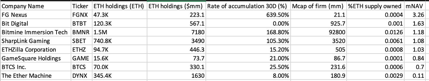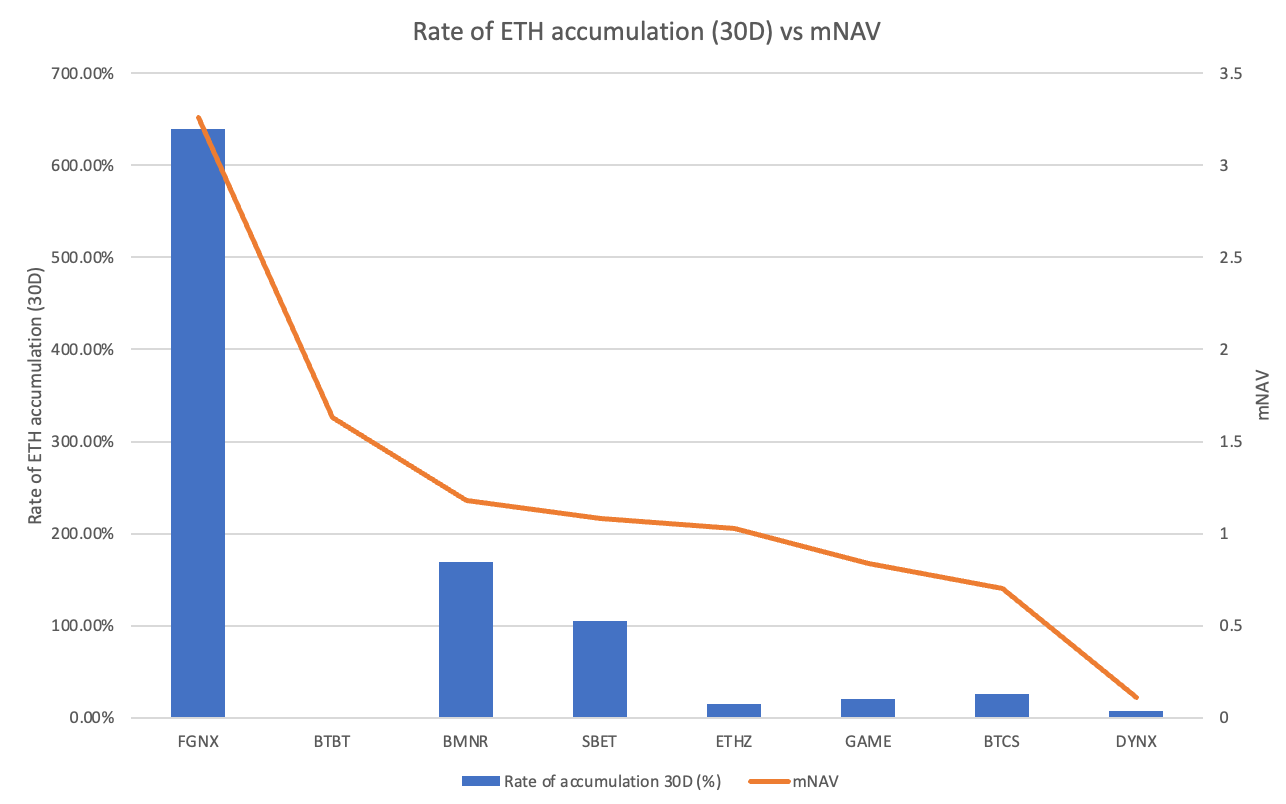 This could suggest that firms that are actively and continously building their reserves like FGNX, BMNR, SBET, are seen as credible Ether treasury players and have their mNAV > 1 while firms with slower accumulation struggle to command premiums (mNAV < 1). This suggests investors are valuing not just the size of the Ether on balance sheet, but the momentum of accumulation.