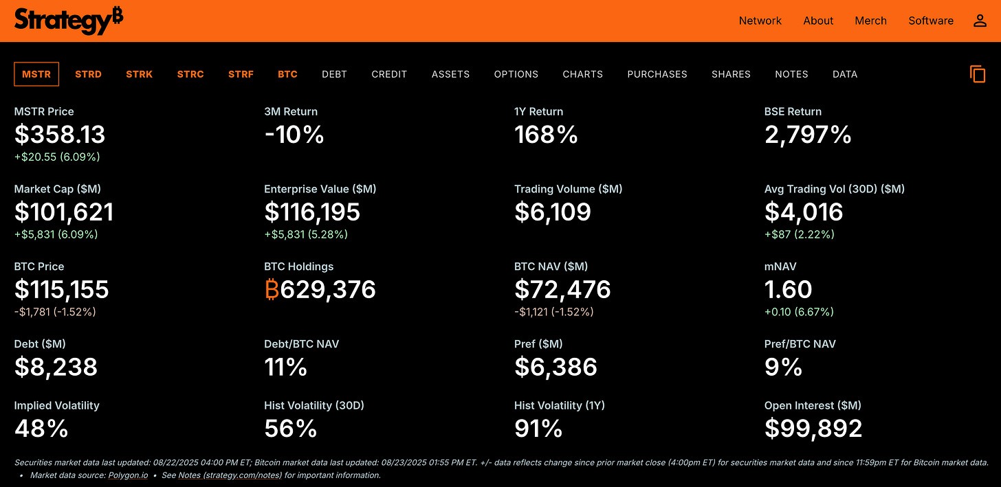 This leveraged financing strategy enables Strategy to acquire significantly more Bitcoin than its cash reserves would permit, driving an mNAV range of 1.6–2.1 in 2025, where its enterprise value (market capitalisation + debt + preferred stock - cash holdings) exceeds the $72.5 bn market value of its 630k Bitcoin holdings. With an enterprise value of approximately $116 bn in Aug 2025, Strategy’s mNAV of ~1.6 reflects investor confidence in its ability to increase Bitcoin per share through low-cost capital raises, such as 0% convertible notes and ATM sales.
