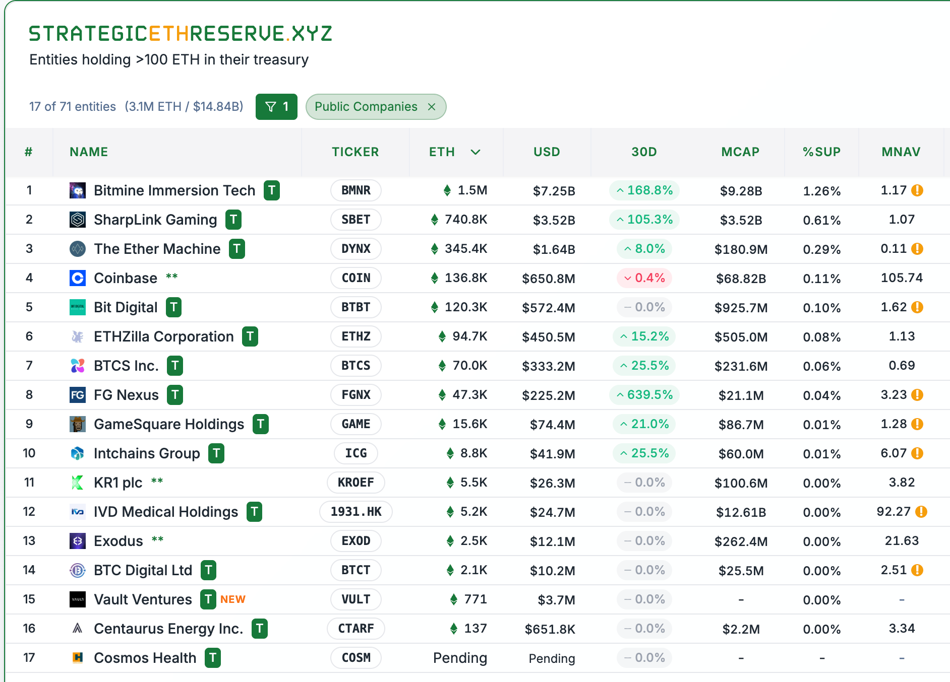 To discuss, the high-accumulators continue to command higher mNAV premiums. For example, BMNR has solidified its lead as the world's largest Ether treasury holder, with 1.52 million Ether, driven primarily by aggressive ATM (at-the market) equity raises with an even grander ambition to raise up to $20 bn to purchase more. This strategy is followed closely by SBET, which maintained their steady accruals via similar mechanisms. Slower firms like DYNX (post-SPAC merger with ~345K ETH) and BTCS (~70K ETH) have seen minimal net additions, with BTCS focusing on dividend payouts in Ether, rather than pure stacking.